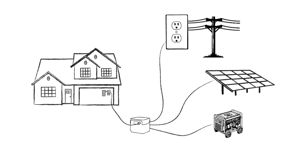 You can’t just add a battery to your breaker box directly. The first piece of magic is the transfer switch.
