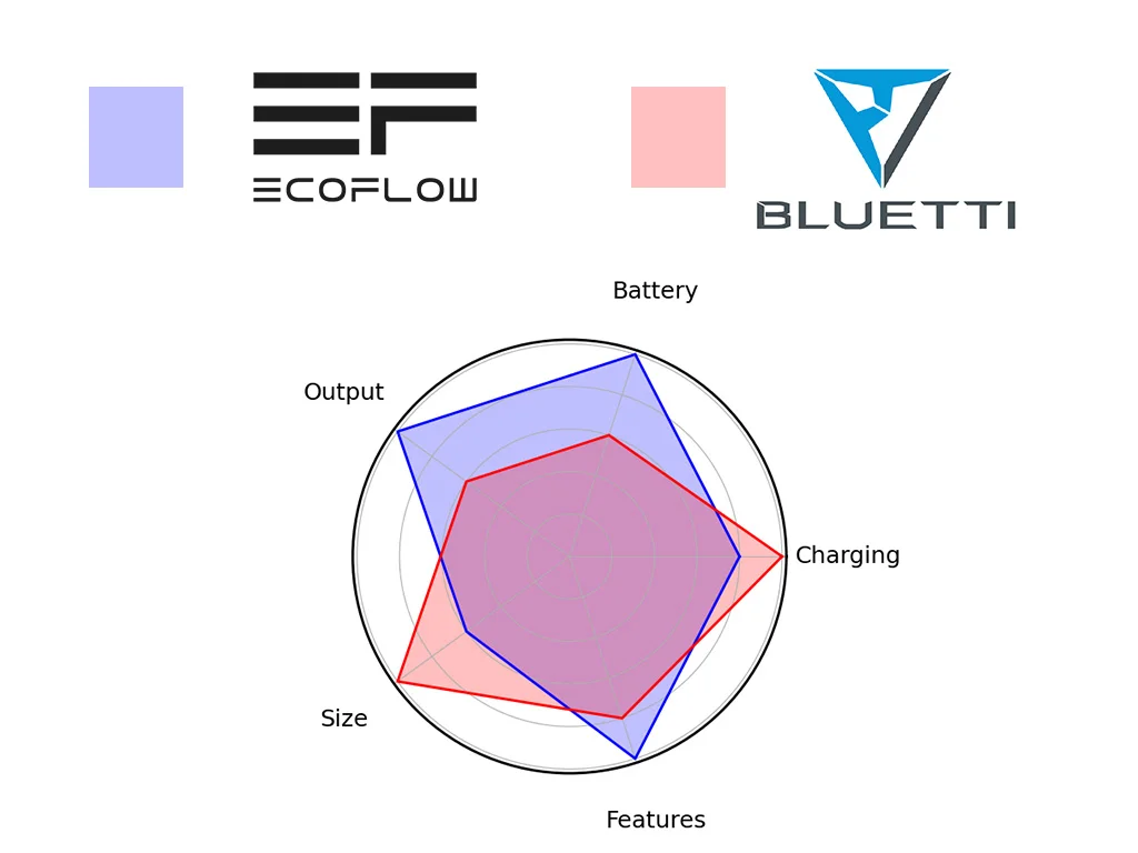 - Charging Speeds: EcoFlow takes the lead again with faster AC and solar input rates, but Bluetti’s high solar voltage is very practical and makes it much easier to reach the 2,400W maximum.
